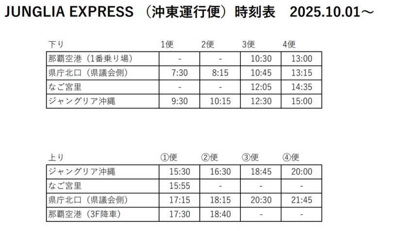 那覇市内⇔JUNGLIA間のJUNGLIA EXPRESS(沖東運行便)に関しましては、以下情報をご確認ください。