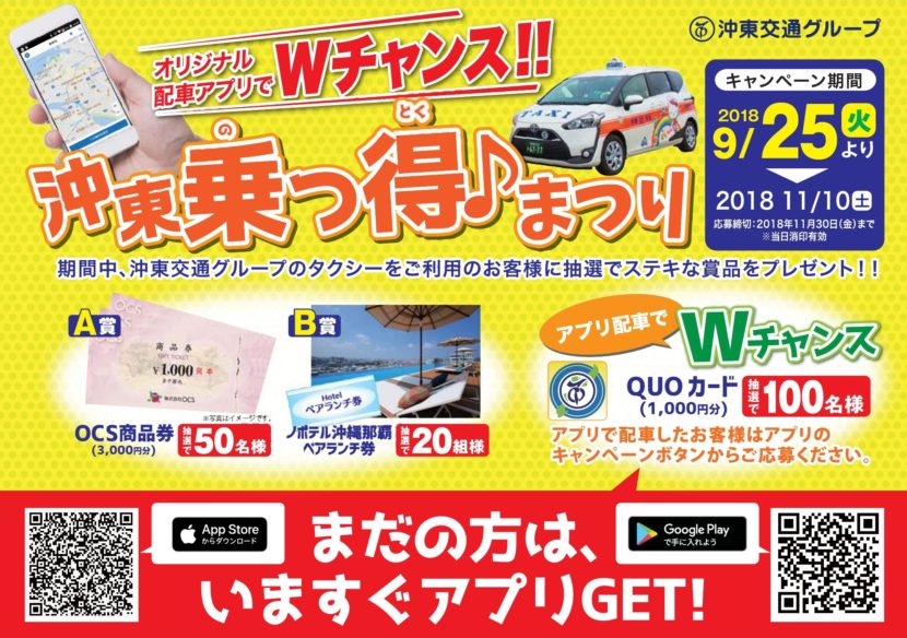 なんと!沖東アプリでタクシーを呼ぶとWチャンスでQUOカードが当たります!!