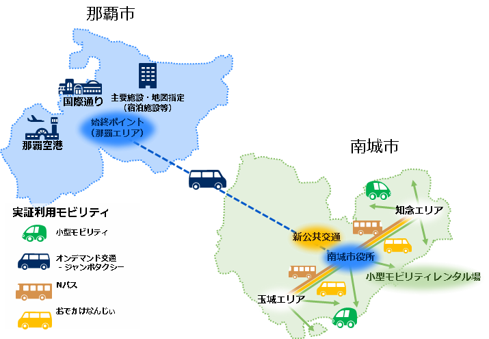 本実証実験の観光型MaaSは、ジャンボタクシーによるオンデマンド交通を利用した那覇空港や那覇市中心部から南城市への移動、および小型モビリティや南城市内の新公共交通網(2019年10月から運用を開始した支線バス「Nバス」と南城市のオンデマンドバスサービス「おでかけなんじい」)を利用した南城市内の周遊に、南城市内の観光体験等を組み合わせたものです。実施期間中、募集型企画旅行として一般に有料で提供します。